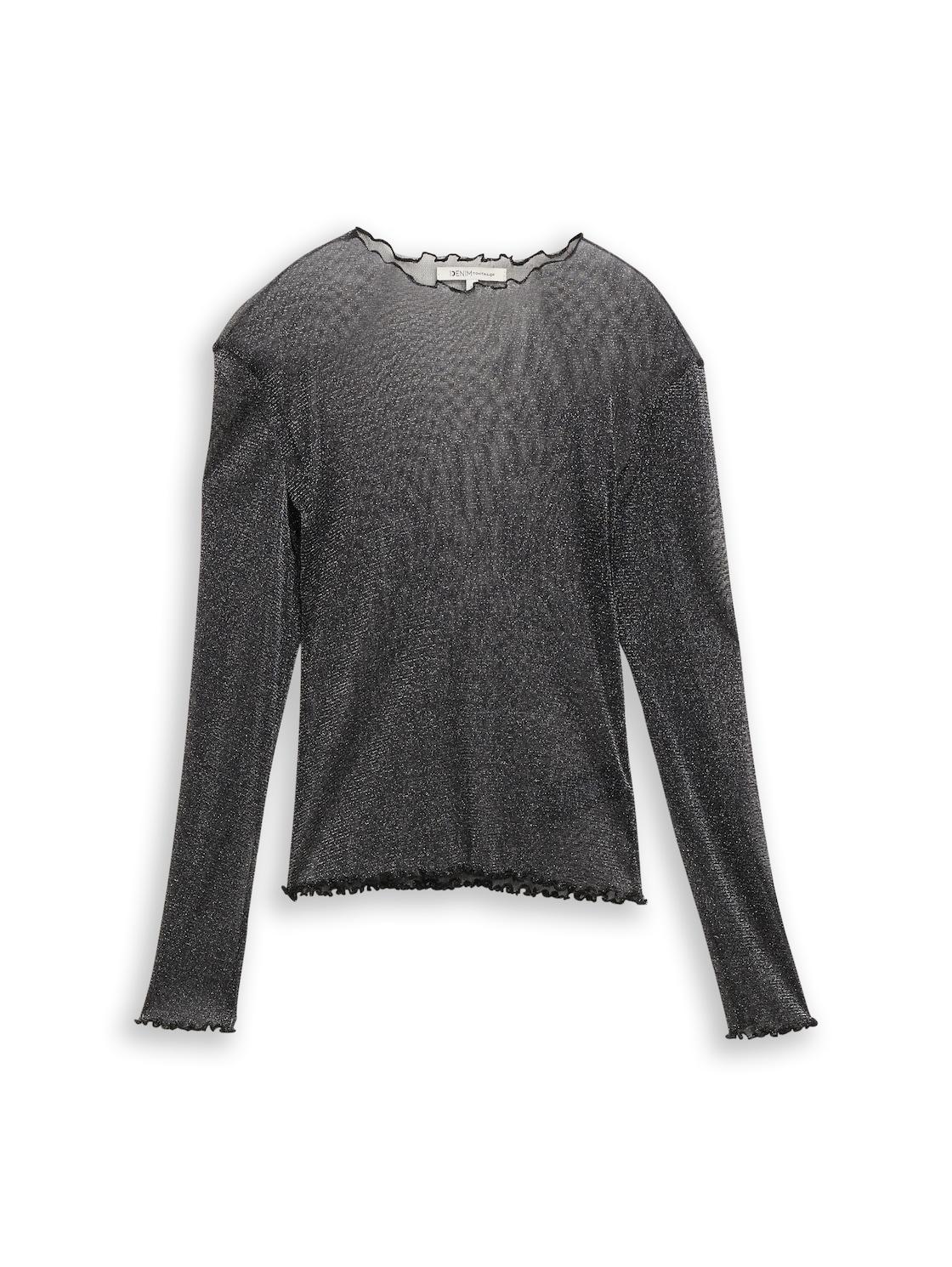 TOM TAILOR DENIM Damen Mesh Langarmshirt mit Glitzer-Effekt, schwarz, Uni, Gr. S